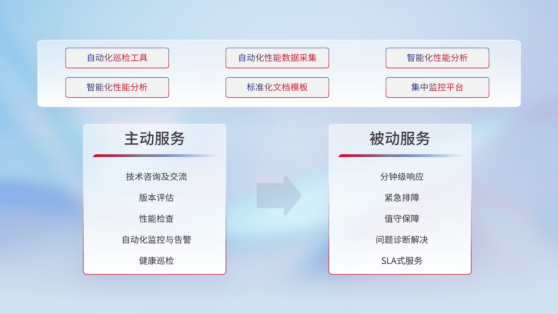 智能化工具和标准化文档,,保障服务质量,,提供主动服务(包含技术咨询、、、、版本评估、、、、性能检查、、、自动化监控与告警、、、、健康巡检)和被动服务包含(分钟级响应、、紧急排障、、值守保障、、、问题诊断解决、、、、SLA服务)。。。。